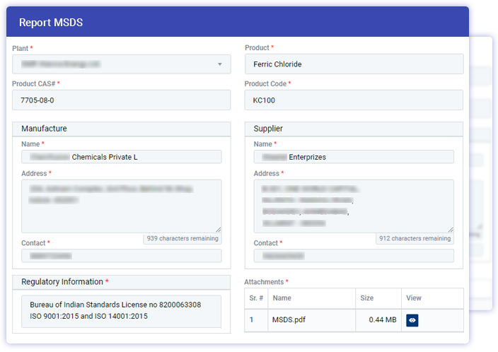 • It allows users to keep centralized records of manufacturer and Supplier of Hazardous substances and chemicals along with their MSDS