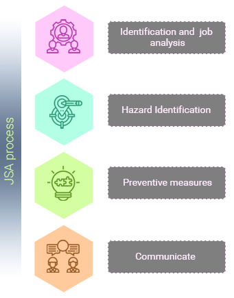 Job safety analysis (JSA) helps Identifying danger of specific tasks in order to reduce risk of incident or injury to worker. Other terms used to describe this procedure are Job hazard analysis (JHA), Task Risk Assessment (TRA) and Hazard Identification and Risk Assessment (HIRA).
